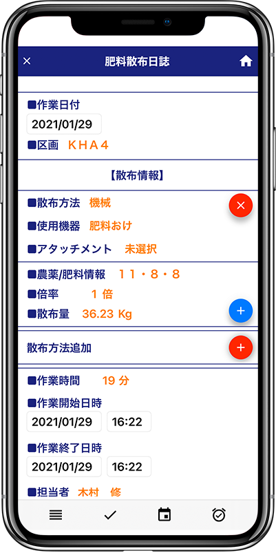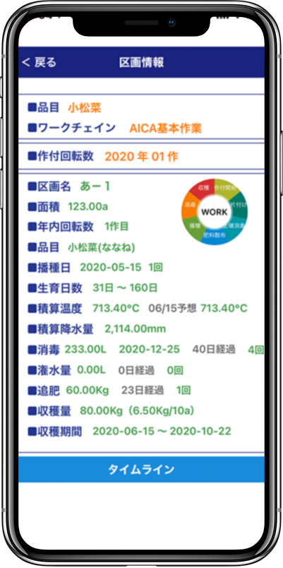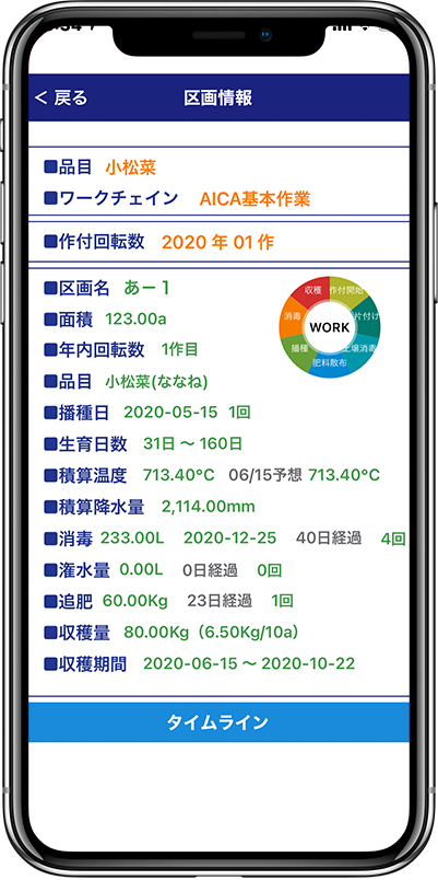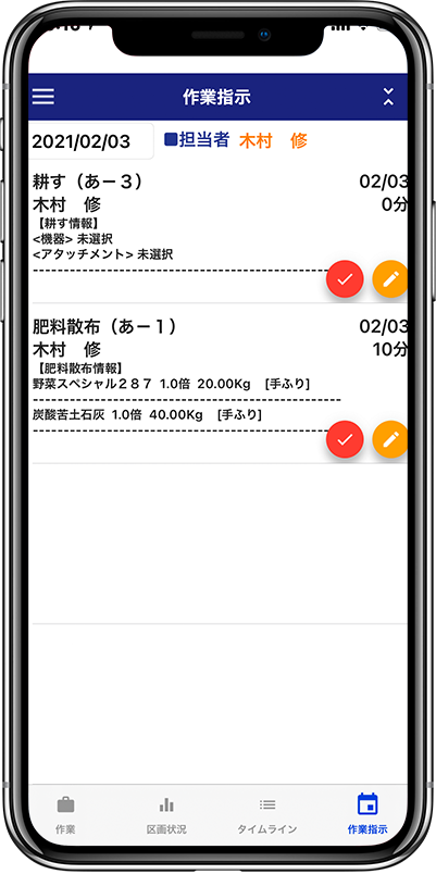 各圃場の作業状況はワークチェーンで一発確認。また作業選択時は、その作業を行うべき圃場をリストアップしてくれます